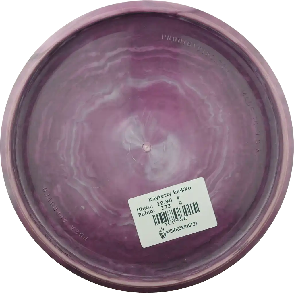 Käytetystä kiekosta löydät kuntoluokituksen lisäksi kolme tuotekuvaa (kansi, pohja ja siipi), painon (g) sekä tiedot tussimerkinnöistä.