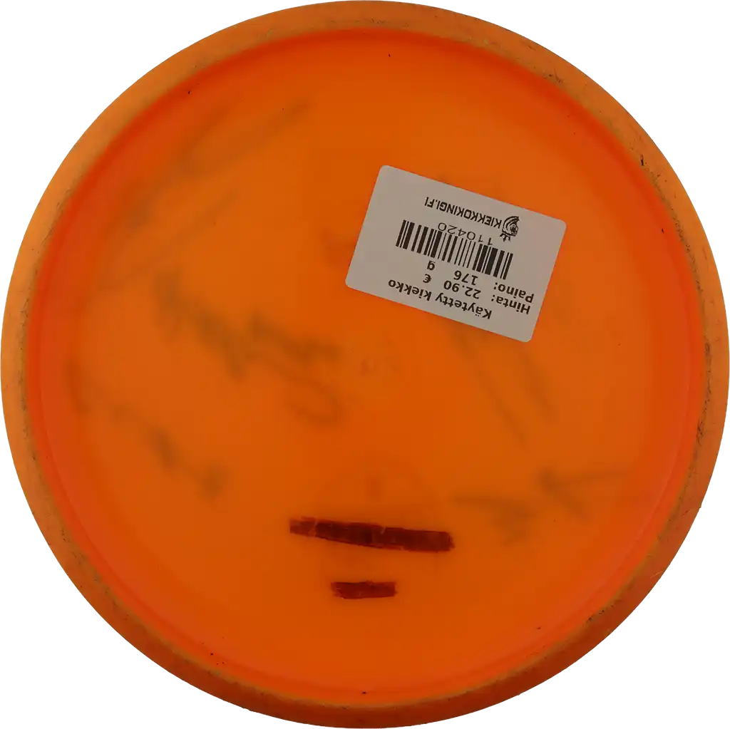 Käytetystä kiekosta löydät kuntoluokituksen lisäksi kolme tuotekuvaa (kansi, pohja ja siipi), painon (g) sekä tiedot tussimerkinnöistä.